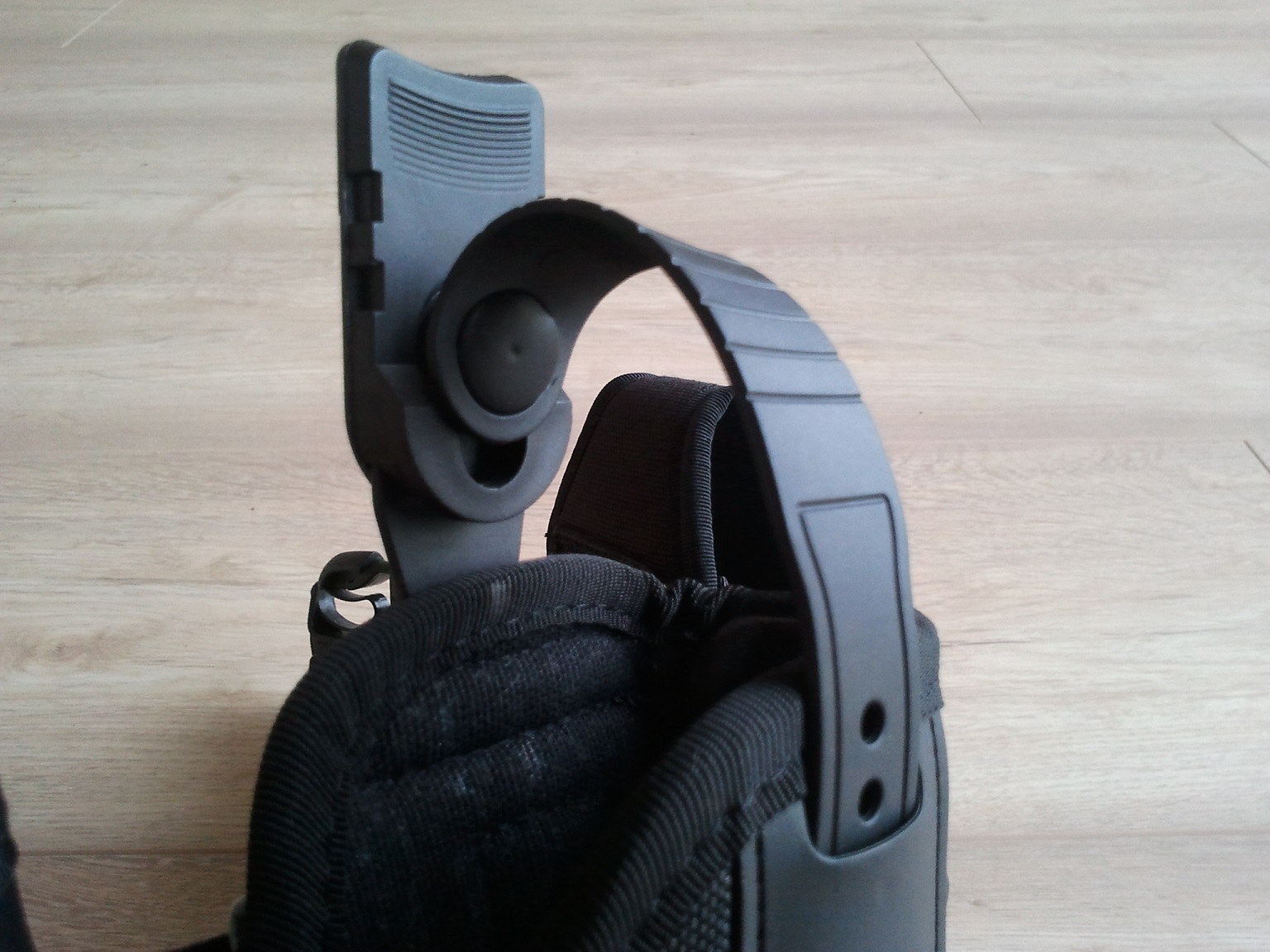 Ce holster est en Cordura, matière légère et résistante. Pour environ 35€ (Ici par exemple), disponible pour les droitiers comme pour les gauchers, cet étui permet d’accueillir aussi bien le SIG que le MAS G1. Le passage d’une arme à l’autre se fait très rapidement en réglant la hauteur de la pate de rétention située sur le dessus. Cette compatibilité permettra donc d’avoir l’énorme avantage de pouvoir porter l’arme qui est remise en renfort, à l’inverse d’un holster de dotation.